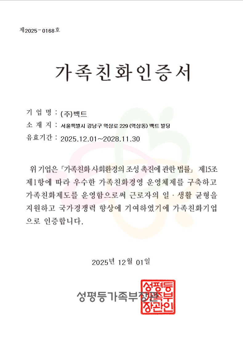스마트 에듀테크 전문기업 벡트가 성평등가족부 주관 '가족친화기업' 인증을 획득했다고 5일 밝혔다.