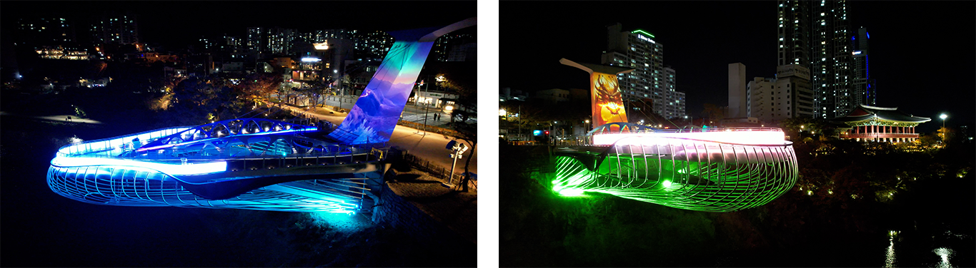 태화루 용금소 스카이워크는 태화강 절벽 위로 약 53미터(m) 돌출된 구조물이다. 벡트는 15mX8m 규모의 디지털 캔버스에 고화소 레이저 프로젝터 6대와 자체 개발한 ‘지오메트릭 마스킹(Geometric Masking)’ 기술을 적용해 입체 구조물에서도 왜곡을 최소화한 영상 구현 환경을 구축했다.